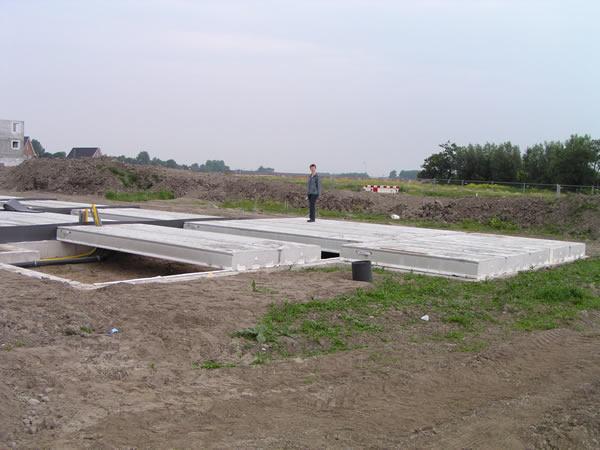 17 juni 2003 Het begin is er. Een groot gedeelte van de vloer is gelegd. Drie delen ontbreken nog, maar die zullen op woensdag de 18e wel op hun plaats worden gelegd. Nog nooit geweten dat beton zo leuk was. Ik kijk er steeds weer naar uit dat er iets veranderd. Er staat behoorlijk wat materiaal op de bouwplaats. Vloeren, wanden etc. Er gaat gebouwd worden! |