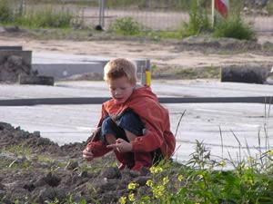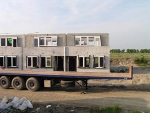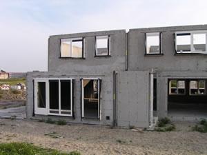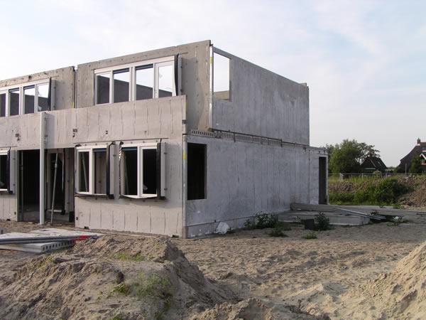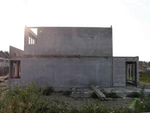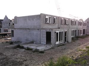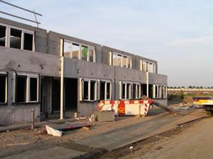 7 juli 2003. De eerste verdieping is geplaatst. Heel langzaam begint het nu een huis te worden. Morgen komen ook hier week vloeren op en ten slotte de dakpunten. Aan de voorkant is nu duidelijk het balkon te zien. Ook op iedere verdieping (behalve op de zolder) is een raam in de zijgevel. |