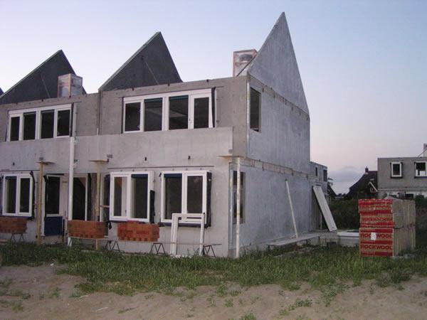 Een snel en kort bezoek aan de bouwplaats. Het is al bijn donker. Om het huis staat stelwerk en de stenen staan klaar. Isolatiemateriaal is nog niet aangebracht, maar staat ook al klaar |
