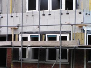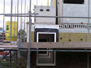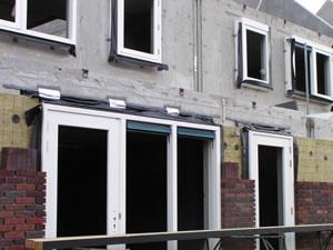 Voorbereidingen worden getroffen voor het metselwerk om de kozijnen heen. Materiaal wordt aangebracht om de kozijnen te beschermen en het water af te voeren dat op de kozijnen terecht komt in de spouw. |