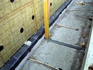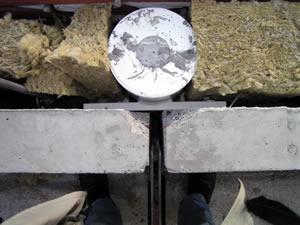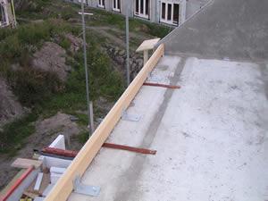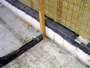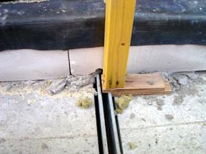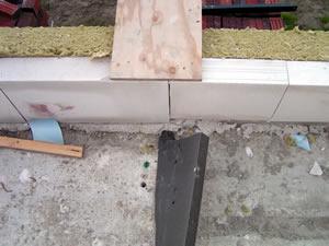 Op de twee foto's links zie je dat de spouw is doorgemetseld. Hierdoor ontstaat een geluidsbrug tussen beide woningen. Deze foto is genomen op het balkon aan de voorzijde van de woning. | ||