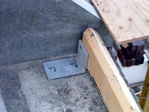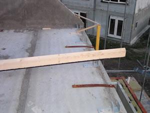 Op deze foto's is te zien hoe het dak wordt vastgezet. Het dak heeft boven in de nok een scharnier. Aan de onderkant leunt het dak gewoon tegen deze balken. | ||