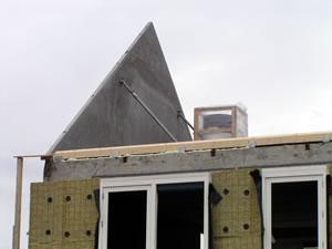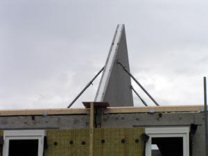Op de rechter foto valt ineens op dat er tape is geplakt over de beide dakpunten. De daken vallen tussen de muren. De muren hebben dus geen dragende functie in de dakconstructie. |