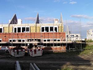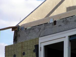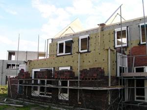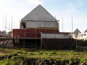 Maandagavond. Het steiger is inmiddels verhoogd. En let op..... Het raam op de eerste verdieping is geplaatst. Het metselen kan weer beginnen. |