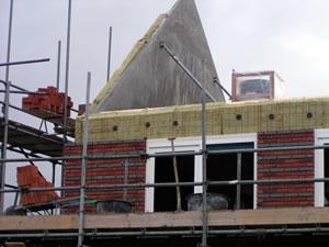 Het isolatiemateriaal is aangebracht tot aan de daklijn. Ik durf te wedden dat we nog deze week een dak op het huis hebben. |