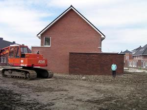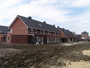 Aan de buitenkant lijkt het huis aardig klaar. Er wordt binnen nog volop geschilderd. De voordeuren zweven nog hoog boven de grond. De voortuinen moeten nog worden opgehoogd. | ||