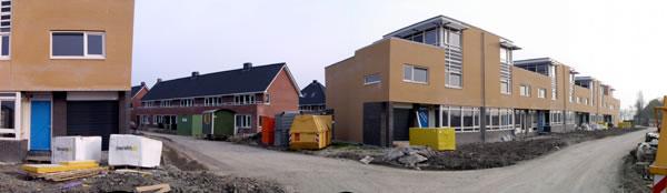 Hier een panoramafoto van het kruispuntje waarop wij uitkijken. De gele woningen zijn van het type Zonnenbloem. |