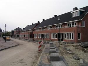 Links een kijkje in de straat. De stoepen links zijn klaar. Aan onze kant is de parkeerstoep klaar, maar moet het trottoir nog worden afgemaakt. | ||
