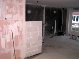 Hier de aanpassingen aan gas en water. Ook zijn de nieuwgeboorde gaten van de toekomstige stopcontacten te zien. | ||