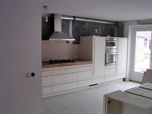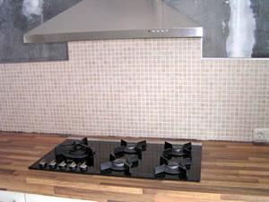 Hier is de keuken betegeld. Kleine tegeltjes (2x2cm) op matjes. Toch een hele klus.