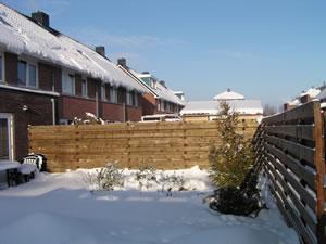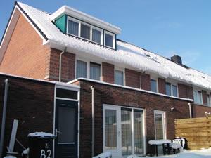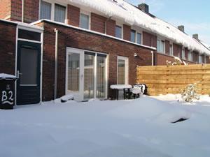 En zo ziet ons huisje er van achteren uit. De sneeuw blijft mooi op het dak liggen. Nu maar hopen dat die dakkapellen van ons een beetje waterdicht zijn. Rechts ons "achterommetje". |