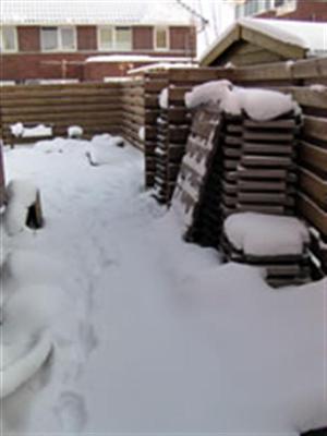 Zo ziet onze tuin er uit in de sneeuw. Alle troep mooi verstopt onder het witte goedje. Ziet er goed uit nietwaar? |