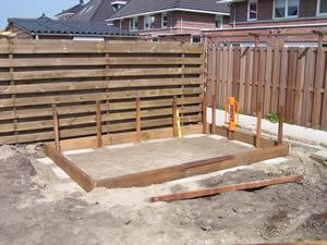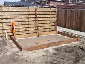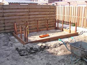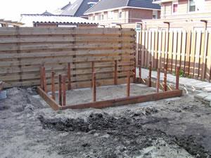 De fundering ligt op zijn plaats en ik kan beginnen met het plaatsen van 18 paaltjes die ieder een ruime meter de grond in gaan. De eerste vijf zitten er in. |