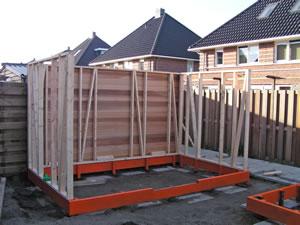 De fundering heb ik voor de zekerheid met rode menie behandeld. Je weet maar nooit nietwaar? De achterwand kan geplaatst worden. Deze is helemaal kant en klaar. Ook is hij een aantal malen groen geschilderd. We kunnen er nu nooit meer bij. Nu maar hopen dat we het verstandig hebben aangepakt.