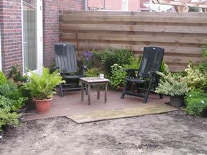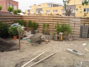 Zo ziet de rest van de tuin eruit. Er moet nog vreselijk veel gebeuren. Er moet nog heel veel zand en grond versjouwd worden en er moeten op diverse plaatsen nog heel veel tegels worden gelegd. |