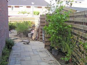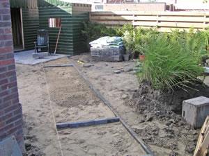 Er komt steeds meer plaveisel in de tuin. Hier is het pad door de tuin aan het ontstaan. Eerts de stoeprandjes en daarna de steentjes ertussen. |