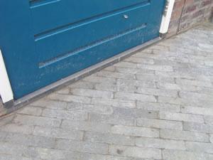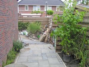Links: de aansluiting van de steeg (achterom) op het pad door de tuin. Rechts: het snel dichtgelegde pad. Een half uurtje werk. Nu alleen nog even alle halve steentjes op maat zagen. Dat is een paar uur werk. |