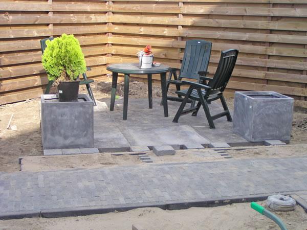 Rondom de 9 tegels komt nog een rand van 20x20cm tegels en een stoeprandje en dan is ook dit terras klaar! De grijze bakken lijken ook van beton, maar die zijn van plastic!